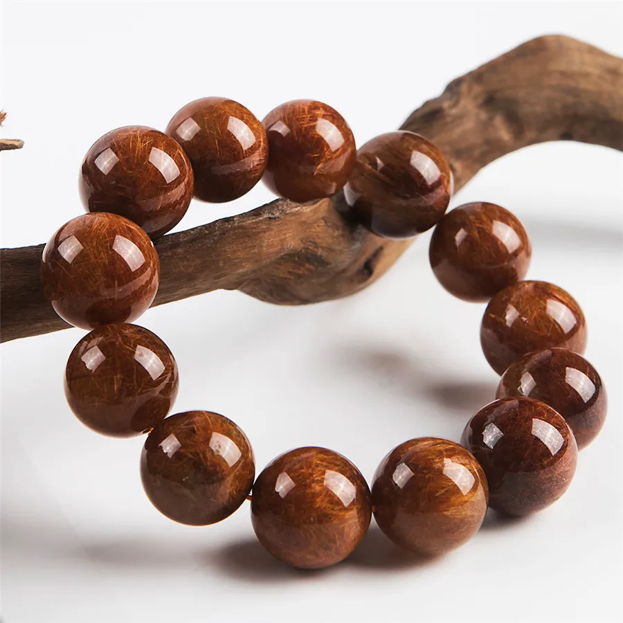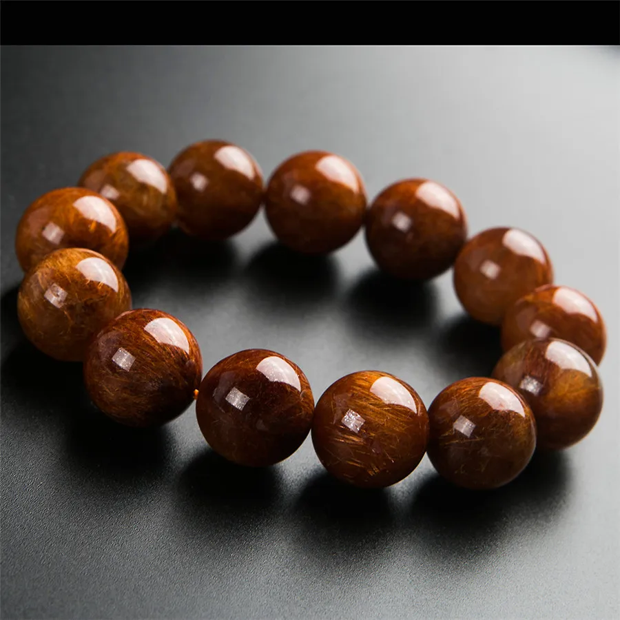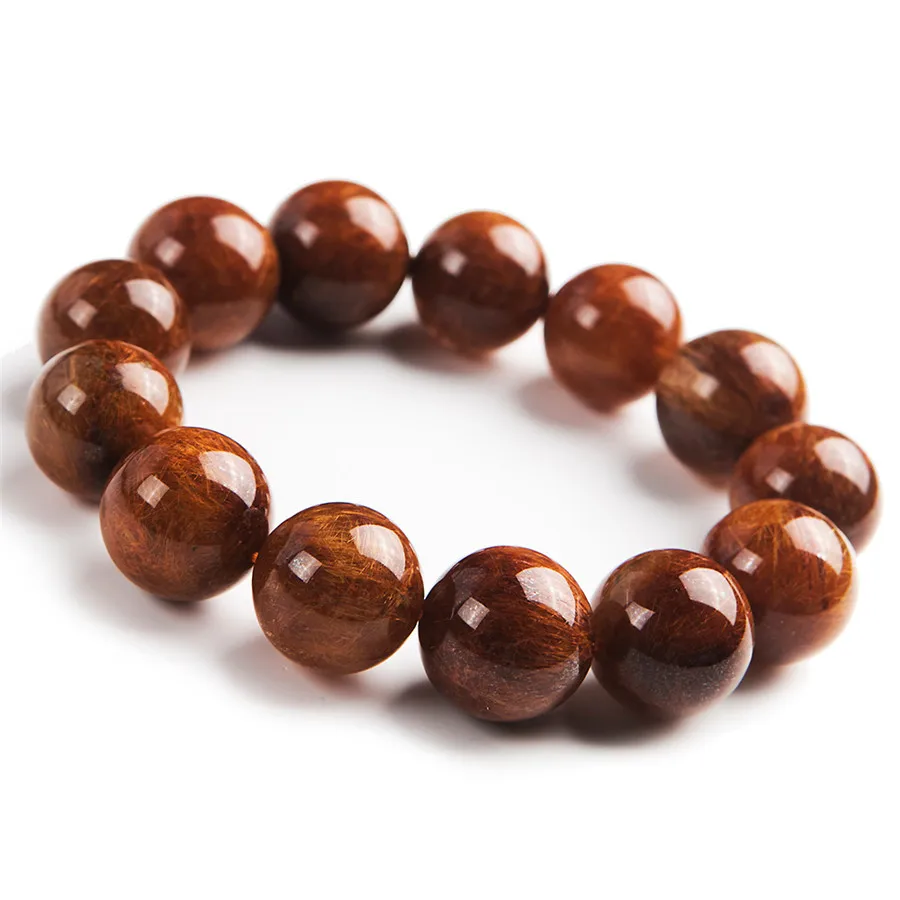 Genuine Natural Copper Hair Rutilated Quartz Crystal Women Lady Charm Round Bead Bracelet 18mm